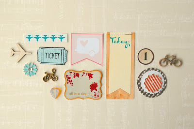 Then I went looking for my evidence, using the list as the basis of an eclectic embellishment 'add on'. I found some little travel themed wooden veneer embellishments; a dinky bicycle charm; some beautiful, little autumn leaf beads and some 'transportation' themed die-cuts. I added a few extras that match the colour theme - and think I have a small, but cute collection. I popped them all into a small bag (which you can see in the photograph above) for safe keeping!