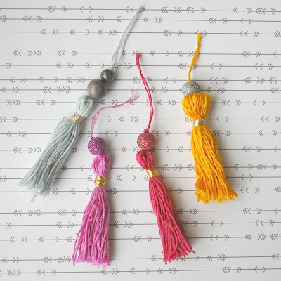 I chose these lovely, colourful tassels from the Maggie Holmes 'Shine' Collection, for Crate Paper. To recreate them, I raided my stash of embroidery threads and found a few co-ordinating beads. Once I'd tried making a couple, I found a method that seems to work well - and I wanted to share it!