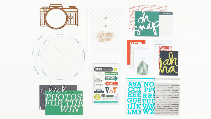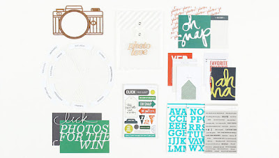 It's March! Already?! A new month means a new inspirational 'kit to counterfeit' from The Counterfeit Kit Challenge and this month our inspiration is the 'Click' Story Kit from Ali Edwards. It's definitely not a 'traditional' scrapbooking kit, with no scrapbook papers, or cardstock, and an emphasis on pocket-style scrapbooking instead! The colour combination is lovely, but unusual - Green, Turquoise, Orange, White and Grey - and there's an obvious camera/photography theme (which I seem to have completely ignored when putting together my kit!)